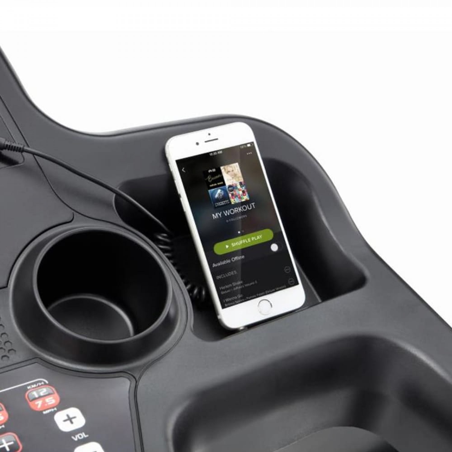 | Features | Quick Speed & Incline Keys Integrated Hand Pulse Sensors iPod Connectivity (via wire) Speakers, Dual Bottle Holders Transport Wheels, Floor Level Adjustment Foldable, MP3 Input with 5W Speakers ONE Series Cushioning Auto-Stop Safety Key, Soft drop Hydraulic Folding Built-in Transport Wheels, Two Storage Trays |