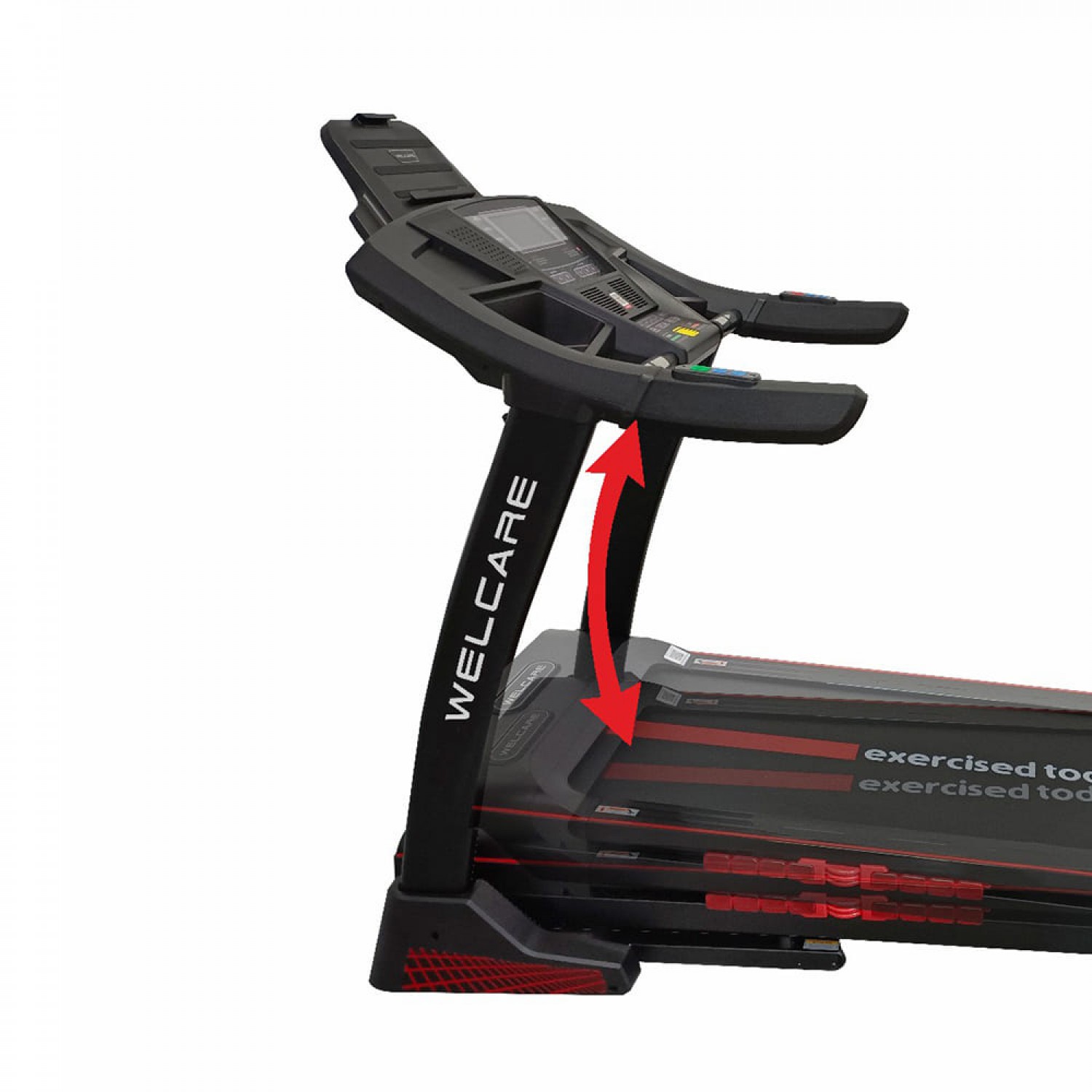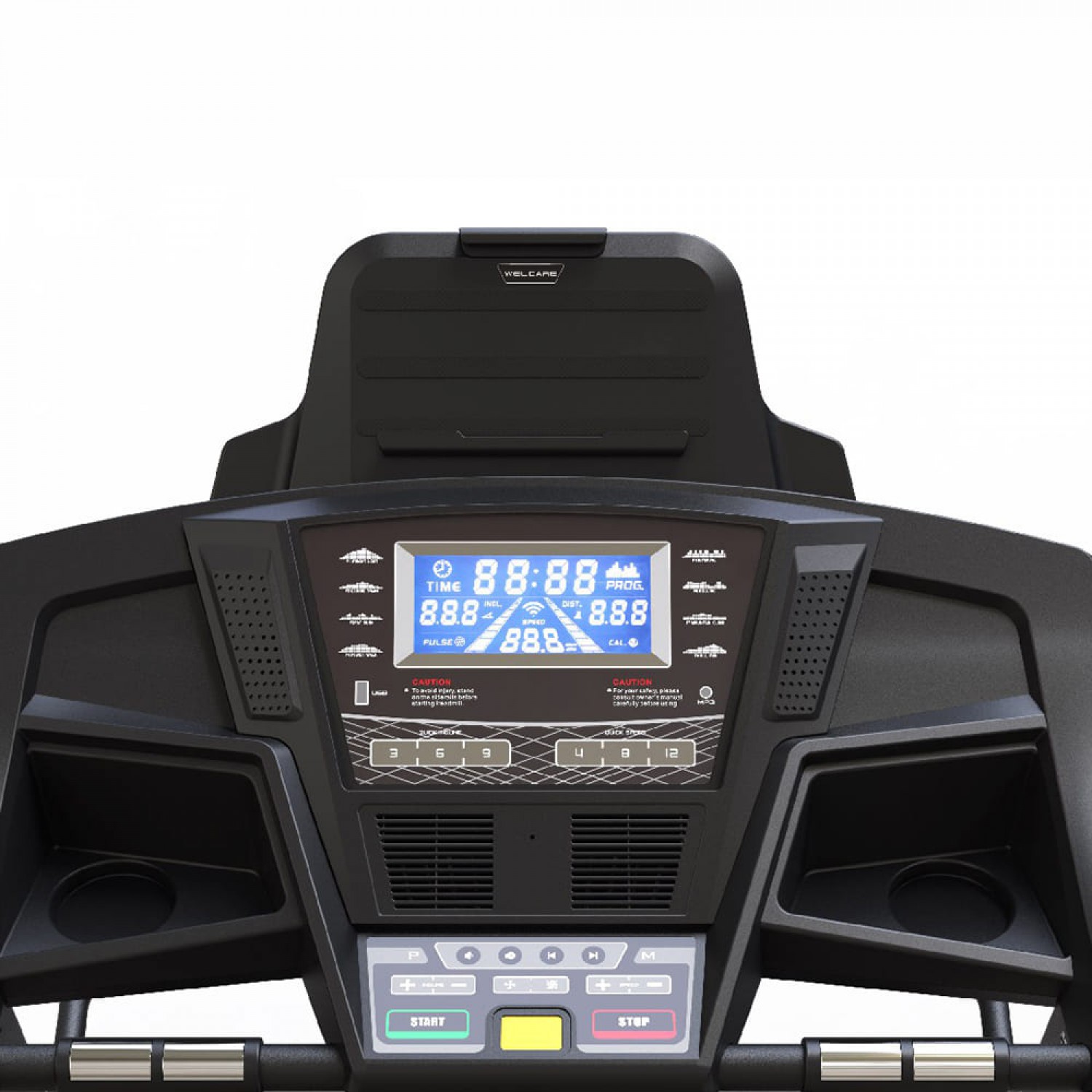 Experience the epitome of home fitness with the WC5959 Motorized Treadmill, meticulously designed for serious runners and fitness enthusiasts. Boasting a robust 2-HP AC motor, this treadmill delivers speeds up to 1–20 km/h and offers a maximum incline of 15 Level Auto, providing a challenging workout tailored to your needs. The spacious extra-long running belt ensures a comfortable stride, while the integrated LCD display keeps you motivated with real-time progress feedback. Immerse yourself in your favorite music with the built-in Bluetooth speakers, and stay cool during intense workouts with the integrated cooling fan. Safety features, including a safety key and emergency stop button, offer peace of mind. With 64 programs and a walking area of 1500 x 510 mm, the WC5959 is your ultimate home fitness solution. Invest in your health with Welcare’s top-tier gym equipment lineup, featuring treadmills, ellipticals, and more, designed to meet your fitness goals with unmatched quality and performance