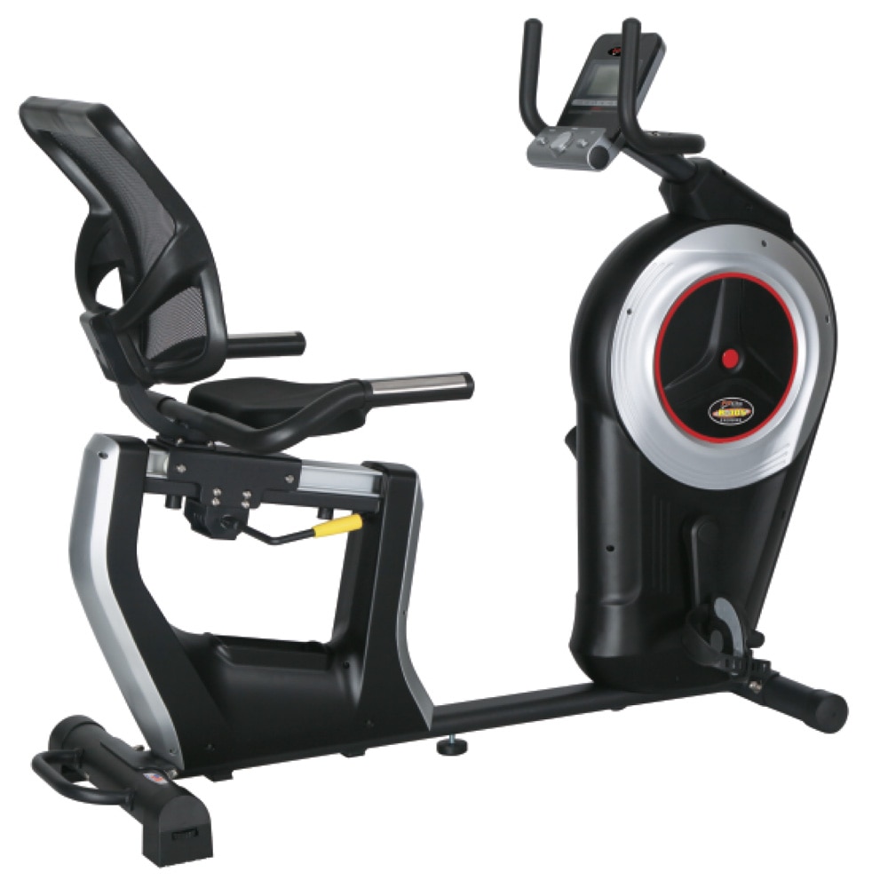 CLUB COMMERCIAL RECUMBENT BIKE. MOTORISED MAGNETIC BIKE WITH SMOOTH AND QUITE BELT DRIVE SYSTEM. STEP THROUGH FRAME FOR EASYACCESS. DUAL COLOUR BLUE BACKLIT LCD CONSOLE DISPLAY TIME, SPEED, DISTANCE, ODO, WATT, CALORIES, RPM, RECOVERY, PULSE, AGE WITH IPAD / SMART PHONE HOLDER. 13 PRESET PROGRAMS INCLUDING HRC, THR, USER SETTING, RECOVERY AND BODY FAT. 8 KG. OF ROTATING MASS ENSURES SMOOTH AND DYNAMIC MOVEMENT. COMPLETELY ADJUSTABLE, COMFORTABLE SEAT & BACK OFFERS EASY ACCESS AND COMFORT THAT COMPLIES WITH ERGONOMICS.